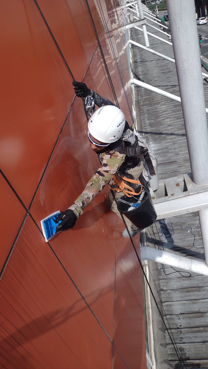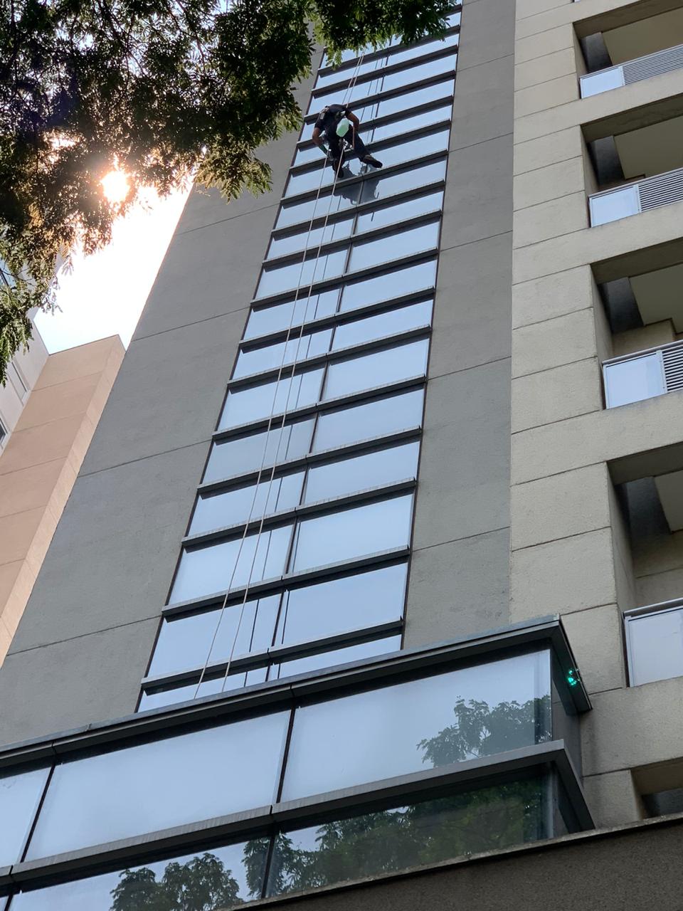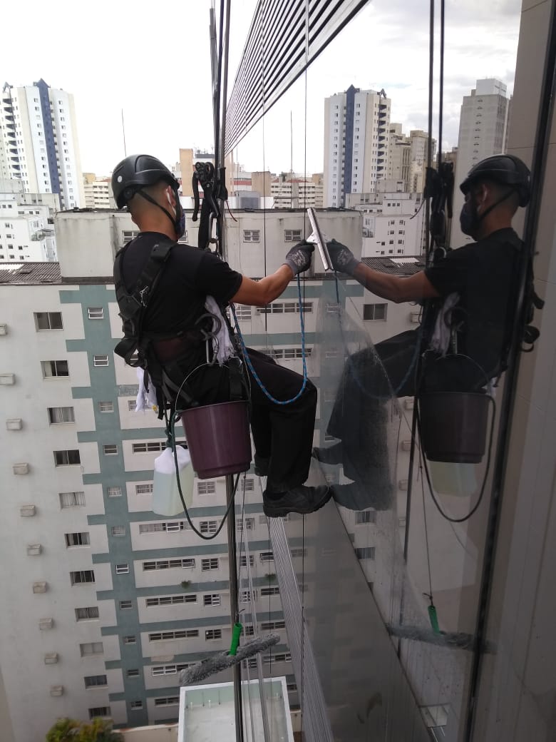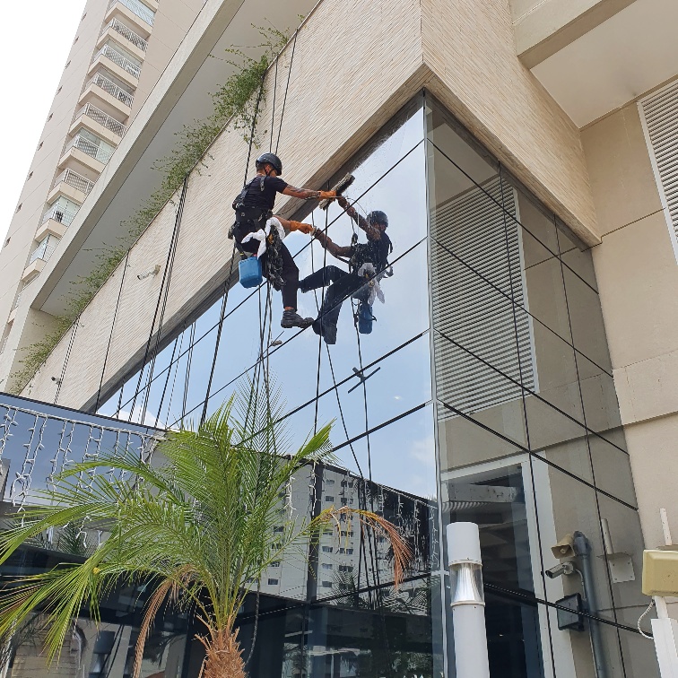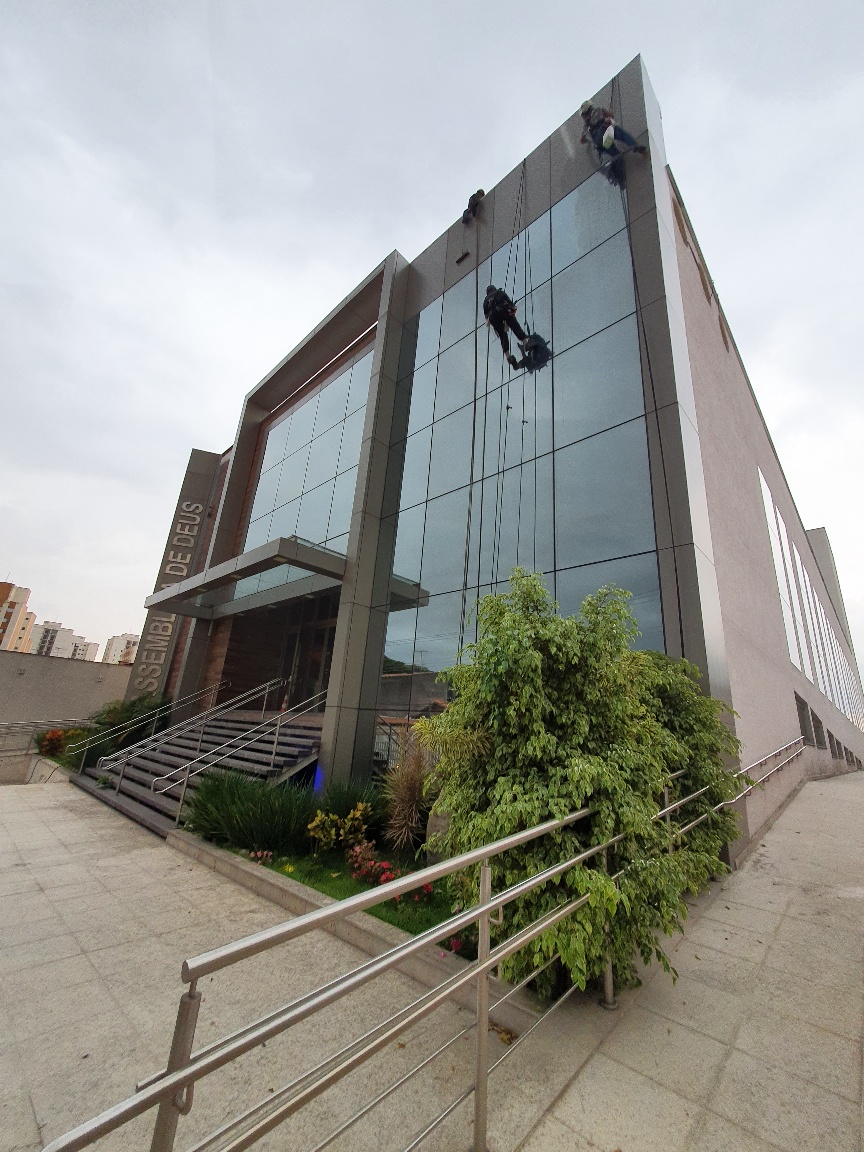 Limpeza de estruturas em pele de vidro, garantindo transparência e durabilidade.